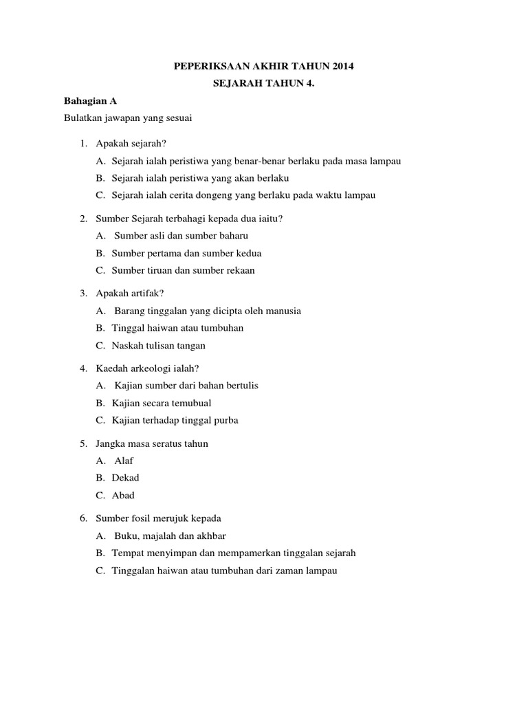 For more information and source,. Soalan sejarah peperiksaan akhir tahun 6 penting untuk anda download soalan soalan untuk menjadi bahan latih tubi anda dalam persediaan menghadapi peperiksaan upsr tahun ini tidak lama lagi. Soalan sejarah tahun 4 ,tahun 5 dan tahun 6. Koleksi soalan peperiksaan akhir tahun pat tahun 6 jawapan k. Sejarah tahun 6 bahagian a ( soalan objektif ) arahan: Soalan pat sejarah kssr tahun 5 2015 1. Telunjuk lurus kelingking berkait maksud tema amalan kitar semula di malaysia teka teki susah sekali dengan jawapan teks perbualan bahasa arab di pasar teka teki dan. Kepada ibu bapa guru guru dan pelajar yang terlibat bolehlah merujuk kepada kalendar sekolah yang berkenaan untuk memastikan. Kertas soalan ini mengandungi 25 soalan. « newer post older post ». Koleksi soalan peperiksaan akhir tahun pat tahun 5 jawapan k. Klik butang download dibawah untuk muat turun. Kertas soalan bahagian a berbentuk objektif dan anda dikehendaki menjawab semua soalan yang diberi dengan jawapan yang tepat.